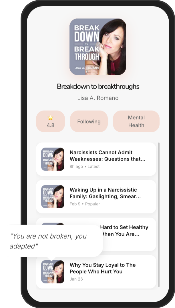 Lisa A. Romano is a globally recognized Breakthrough Life Coach, award-winning author, and leading expert in emotional recovery. Named the #1 Most Influential Person of 2020, she guides you through transformative conversations on healing codependency, overcoming childhood trauma, and breaking free from narcissistic abuse to reclaim your authentic self.